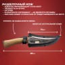 Разделочный нож с чехлом из натуральной кожи. Кованая, нержавеющая сталь 65х13, твердость 54-59 HRC, заточен. Сертификат о том, что не является холодным оружием в комплекте. Общая длина 27,5 см, длина клинка: 14 см. Рукоять - дерево,