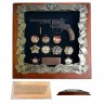 Пистолет выполнен в технике гальванотехники - осаждение металла (в данном случае медь) под воздействием электрического тока (катод-анод), на форме. Технология позволяет создавать идеальные копии исходного предмета, широко применяется при реставрации. Т.е. это не макет пистолета, а оттиск, его барельеф, внутри полый. Достать его нельзя, он вклеен в панно.