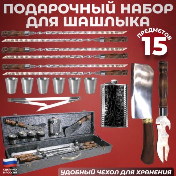 Подарочный набор для шашлыка - комплект аксессуаров для приготовления мяса на огне и подачи блюда к столу во время пикника. Состав различен, но из шашлычных принадлежностей здесь есть шампуры (или решетка для гриля) и вещи для сервировки барбекю. Продаются такие сеты обычно в кейсе или в колчане, но допустима и иная упаковка. Размер упаковки: 61 х 14,5 х 9 см Материал: металл, дерево, искусственная кожа Набор состоит из 16 предметов