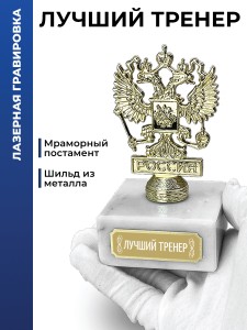 Наградная статуэтка с изображением герба на мраморной подставке. Подходит для размещения в интерьерах административных помещений и коллекций государственной символики.