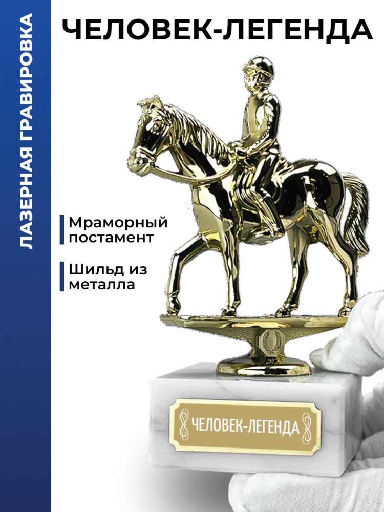 Лазерная гравировка наносится на табличку (шильд), приклеенную к подставке. Размер: 14,4 x 6,5 x 6,5 см. Высота фигурки без постамента: 11,4 см. Размер мраморной подставки: 6,5 x 6,5 x 3 см. Размер шильдика: 5 x 1,7 см. Материалы: Пластик (фигурка), мрамор (постамент). Вес: 364 гр. Упаковка: картонная коробка. Наградная статуэтка с тематикой конного спорта. Подходит для награждения участников соревнований, выставок и клубных мероприятий. Используется в оформлении витрин и спортивных интерьеров. Оригинальный подарок на любой праздник или награждение. Он станет достойной памятной наградой за победы и достижения от коллектива на память. Символизирует не только личные успехи, но и благодарность за труд и преданность делу. Актуально в качестве новогоднего сюрприза жене, мужу, отцу, взрослым родственникам (папе, дедушке, маме, бабушке), коллегам (начальнику), преподавателю или юбиляру. Такой красивый сувенир подходит для множества знаковых дат и событий дома и в офисе, на юбилеи родителей, международный женский день (8 марта), 14 и 23 февраля, Новый год или день рождения (ДР). Считается хорошим корпоративным подарком как для мужчин (сыну, брату, другу, любимому парню, руководителю), так и для женщин (начальнице, дочери, сестре, подруге или девушке). Человек, увлечённый спортом - это не только участник соревнований, но и тот, кто живёт движением, дисциплиной и стремлением к победе. Начинающий игрок, тренер, болельщик или экстремал - все выражают страсть к физической активности. Акценты на динамику и мотивацию помогут выделить его путь. 1785