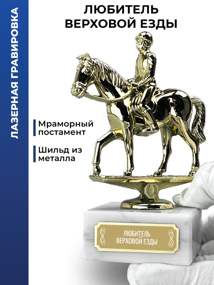 Наградная статуэтка с тематикой конного спорта. Подходит для награждения участников соревнований, выставок и клубных мероприятий. Используется в оформлении витрин и спортивных интерьеров.