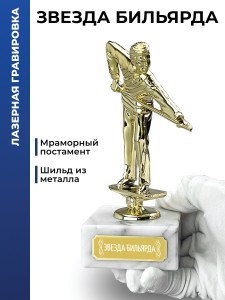 Наградная статуэтка с тематическим дизайном для турниров и клубных соревнований. Фигурка бильярдиста предназначена для размещения в интерьерах бильярдных залов и коллекций спортивных трофеев.