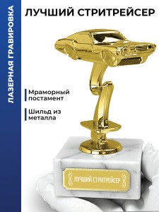 Наградная статуэтка с фигурой гоночного автомобиля. Подходит для размещения в интерьерах автоклубов и коллекциях спортивных трофеев.