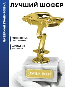 Лазерная гравировка нанесена на табличку (шильд), приклеенную к подставке. Размер: 12 x 6,5 x 6,5 см. Высота фигурки без постамента: 9 см. Размер мраморной подставки: 6,5 x 6,5 x 3 см. Размер шильдика: 5 x 1,7 см. Материал: Пластик (фигурка), Мрамор (постамент). Вес: 364 гр. Упаковка: Картонная коробка. Наградная статуэтка с фигурой гоночного автомобиля. Подходит для размещения в интерьерах автоклубов и коллекциях спортивных трофеев. Оригинальный подарок на любой праздник или награждение. Он станет достойной памятной наградой за победы и достижения от коллектива на память. Символизирует не только личные успехи, но и благодарность за труд и преданность делу. Актуально в качестве новогоднего сюрприза жене, мужу, отцу, взрослым родственникам (папе, дедушке, маме, бабушке), коллегам (начальнику), преподавателю или юбиляру. Такой красивый сувенир подходит для множества знаковых дат и событий дома и в офисе, на юбилеи родителей, международный женский день (8 марта), 14 и 23 февраля, Новый год или день рождения (ДР). Считается хорошим корпоративным подарком как для мужчин (сыну, брату, другу, любимому парню, руководителю), так и для женщин (начальнице, дочери, сестре, подруге или девушке). 1935
