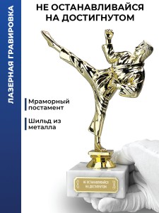 Лазерная гравировка нанесена на табличку (шильд), приклеенную к подставке. Размер: 19,5 x 6,5 x 6,5 см. Высота фигурки без постамента: 16,5 см. Размер мраморной подставки: 6,5 x 6,5 x 3 см. Размер шильдика: 5 x 1,7 см. Материалы: Пластик (фигурка), Мрамор (постамент). Вес: 364 г. Упаковка: Картонная коробка. Наградная статуэтка по карате - подарок для участников чемпионатов, турниров и спаррингов. Этот приз подойдёт для вручения спортсменам, тренерам и судейскому составу. Трофей на мраморной подставке станет украшением полки в спортивной секции, клубе или личной коллекции. Используется как сувенир за успешную аттестацию, победу в поединке или достижение новых званий в спорте. Оригинальный подарок на любой праздник или награждение. Он станет достойной памятной наградой за победы и достижения от коллектива на память. Символизирует не только личные успехи, но и благодарность за труд и преданность делу. Актуально в качестве новогоднего сюрприза жене, мужу, отцу, взрослым родственникам (папе, дедушке, маме, бабушке), коллегам (начальнику), преподавателю или юбиляру. Такой красивый сувенир подходит для множества знаковых дат и событий дома и в офисе, на юбилеи родителей, международный женский день (8 марта), 14 и 23 февраля, Новый год или день рождения (ДР). Считается хорошим корпоративным подарком как для мужчин (сыну, брату, другу, любимому парню, руководителю), так и для женщин (начальнице, дочери, сестре, подруге или девушке). 2220