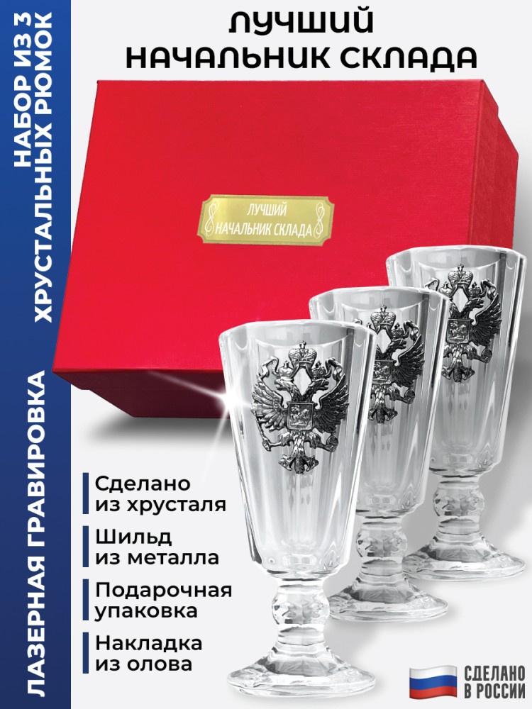 Набор из трех стопок на ножке с гербом - стильный сувенир, подчёркивающий эстетику застолья и сохранение традиций.