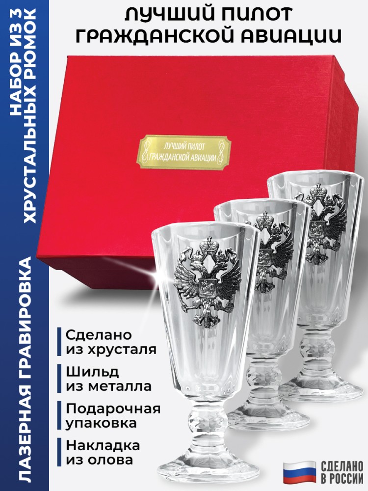 Набор из трех стопок на ножке с гербом - стильный сувенир, подчёркивающий эстетику застолья и сохранение традиций.