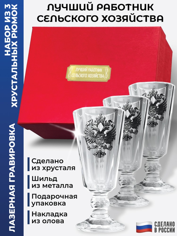 Набор из трех стопок на ножке с гербом - стильный сувенир, подчёркивающий эстетику застолья и сохранение традиций.
