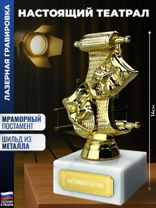 Лазерная гравировка наносится на табличку (шильд), приклеенную к подставке. Размер: 14 x 6,5 x 6,5 см. Высота фигурки без постамента: 11 см. Размер мраморного постамента: 6,5 x 6,5 x 3 см. Размер шильдика (таблички): 5 x 1,7 см. Материалы: пластик (фигурка), мрамор (постамент). Вес: 364 гр. Упаковка: картонная коробка. Наградная статуэтка «Театр» - используется для вручения призов на театральных конкурсах, фестивалях и профессиональных мероприятиях, а также для оформления интерьеров сценических пространств. Оригинальный подарок на любой праздник или награждение. Он станет достойной памятной наградой за победы и достижения от коллектива на память. Символизирует не только личные успехи, но и благодарность за труд и преданность делу. Актуально в качестве новогоднего сюрприза жене, мужу, отцу, взрослым родственникам (папе, дедушке, маме, бабушке), коллегам (начальнику), преподавателю или юбиляру. Такой красивый сувенир подходит для множества знаковых дат и событий дома и в офисе, на юбилеи родителей, международный женский день (8 марта), 14 и 23 февраля, Новый год или день рождения (ДР). Считается хорошим корпоративным подарком как для мужчин (сыну, брату, другу, любимому парню, руководителю), так и для женщин (начальнице, дочери, сестре, подруге или девушке). 1935