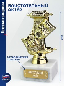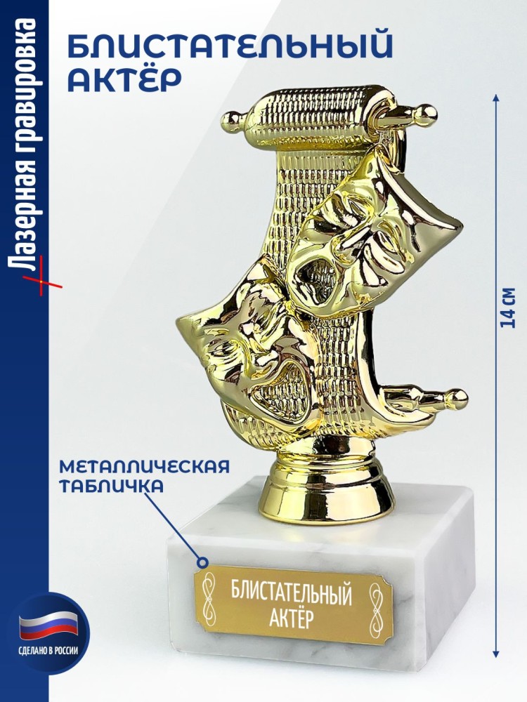Лазерная гравировка наносится на табличку (шильд), приклеенную к подставке. Размер: 14 x 6,5 x 6,5 см. Высота фигурки без постамента: 11 см. Размер мраморного постамента: 6,5 x 6,5 x 3 см. Размер шильдика (таблички): 5 x 1,7 см. Материалы: пластик (фигурка), мрамор (постамент). Вес: 364 гр. Упаковка: картонная коробка. Наградная статуэтка «Театр» - используется для вручения призов на театральных конкурсах, фестивалях и профессиональных мероприятиях, а также для оформления интерьеров сценических пространств. Оригинальный подарок на любой праздник или награждение. Он станет достойной памятной наградой за победы и достижения от коллектива на память. Символизирует не только личные успехи, но и благодарность за труд и преданность делу. Актуально в качестве новогоднего сюрприза жене, мужу, отцу, взрослым родственникам (папе, дедушке, маме, бабушке), коллегам (начальнику), преподавателю или юбиляру. Такой красивый сувенир подходит для множества знаковых дат и событий дома и в офисе, на юбилеи родителей, международный женский день (8 марта), 14 и 23 февраля, Новый год или день рождения (ДР). Считается хорошим корпоративным подарком как для мужчин (сыну, брату, другу, любимому парню, руководителю), так и для женщин (начальнице, дочери, сестре, подруге или девушке). Актёр проживает чужие судьбы, но делает это душой. Театрал, трупповик, лицедей, дублёр, комедиант или трагик - на День актеров и актрис, 27 августа, вспоминают всех, кто на сцене и вне её. 1935