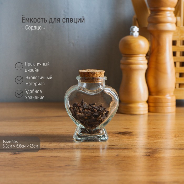 Баночка для специй "Сердце" объемом 85 мл с пробковой крышкой станет отличным дополнением к кухонному интерьеру. Изготовлена из стекла и металла. Эта баночка позволит удобно и компактно хранить различные специи.