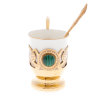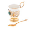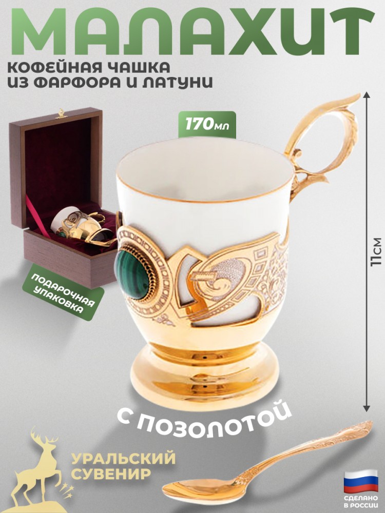 Комплектация: Чашка (фарфор, латунь, малахит, позолота, никелирование), Ложка (нержавеющая сталь), Футляр (дерево).