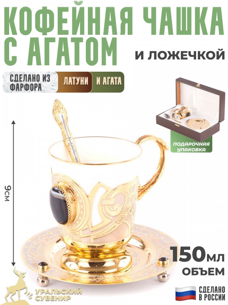 Материал: Чашка и блюдце - Латунь, Фарфор, Позолота, Никелирование, Натуральный камень (агат), Ложечка - Металл (пищевая нержавеющая сталь).