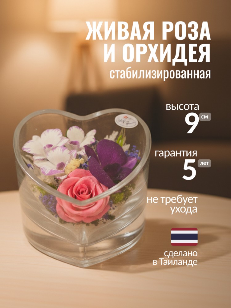 Уникальная композиция, воплощающая красоту и элегантность природы в стекле. Оживите свое пространство неповторимым шармом живых цветов из Таиланда, сохраняющих свежесть на долгие годы.