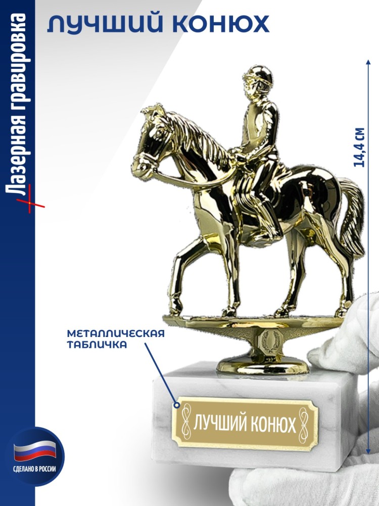 Лазерная гравировка наносится на табличку (шильд), приклеенную к подставке. Размер: 14,4 x 6,5 x 6,5 см. Высота фигурки без постамента: 11,4 см. Размер мраморной подставки: 6,5 x 6,5 x 3 см. Размер шильдика: 5 x 1,7 см. Материалы: Пластик (фигурка), мрамор (постамент). Вес: 364 гр. Упаковка: картонная коробка. Наградная статуэтка с тематикой конного спорта. Подходит для награждения участников соревнований, выставок и клубных мероприятий. Используется в оформлении витрин и спортивных интерьеров. Оригинальный подарок на любой праздник или награждение. Он станет достойной памятной наградой за победы и достижения от коллектива на память. Символизирует не только личные успехи, но и благодарность за труд и преданность делу. Актуально в качестве новогоднего сюрприза жене, мужу, отцу, взрослым родственникам (папе, дедушке, маме, бабушке), коллегам (начальнику), преподавателю или юбиляру. Такой красивый сувенир подходит для множества знаковых дат и событий дома и в офисе, на юбилеи родителей, международный женский день (8 марта), 14 и 23 февраля, Новый год или день рождения (ДР). Считается хорошим корпоративным подарком как для мужчин (сыну, брату, другу, любимому парню, руководителю), так и для женщин (начальнице, дочери, сестре, подруге или девушке). Спорт - это неотъемлемая часть активного образа жизни, объединяющая людей разных возрастов и интересов. Лучший в спорте демонстрирует не только физическую подготовку, но и дисциплину, целеустремлённость. 1785