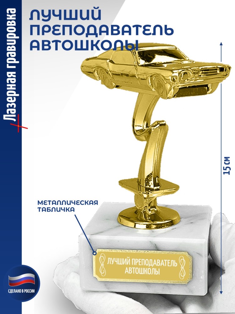 Лазерная гравировка нанесена на табличку (шильд), приклеенную к подставке. Размер: 12 x 6,5 x 6,5 см. Высота фигурки без постамента: 9 см. Размер мраморной подставки: 6,5 x 6,5 x 3 см. Размер шильдика: 5 x 1,7 см. Материал: Пластик (фигурка), Мрамор (постамент). Вес: 364 гр. Упаковка: Картонная коробка. Наградная статуэтка с фигурой гоночного автомобиля. Подходит для размещения в интерьерах автоклубов и коллекциях спортивных трофеев. Оригинальный подарок на любой праздник или награждение. Он станет достойной памятной наградой за победы и достижения от коллектива на память. Символизирует не только личные успехи, но и благодарность за труд и преданность делу. Актуально в качестве новогоднего сюрприза жене, мужу, отцу, взрослым родственникам (папе, дедушке, маме, бабушке), коллегам (начальнику), преподавателю или юбиляру. Такой красивый сувенир подходит для множества знаковых дат и событий дома и в офисе, на юбилеи родителей, международный женский день (8 марта), 14 и 23 февраля, Новый год или день рождения (ДР). Считается хорошим корпоративным подарком как для мужчин (сыну, брату, другу, любимому парню, руководителю), так и для женщин (начальнице, дочери, сестре, подруге или девушке). Учитель формирует не только знания, но и ценности, раскрывает потенциал и вдохновляет на развитие. Каждый предмет - от математики и ОБЖ до литературы - требует терпения, профессионализма и умения слышать учеников. Учащиеся и родители могут выразить признательность на выпускной, в конце учебного года или ко Дню учителя (5 октября). Особенно важно подчеркнуть индивидуальный подход, будь то классный руководитель или преподаватель английского языка, физики или начальных классов. 1935