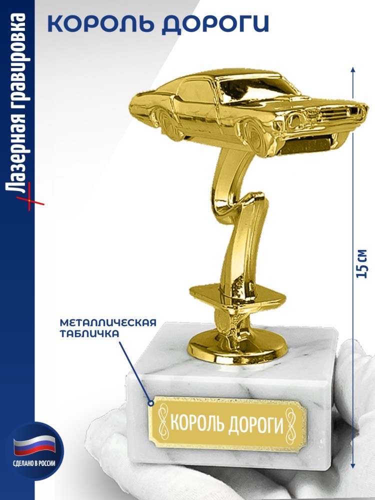 Лазерная гравировка нанесена на табличку (шильд), приклеенную к подставке. Размер: 12 x 6,5 x 6,5 см. Высота фигурки без постамента: 9 см. Размер мраморной подставки: 6,5 x 6,5 x 3 см. Размер шильдика: 5 x 1,7 см. Материал: Пластик (фигурка), Мрамор (постамент). Вес: 364 гр. Упаковка: Картонная коробка. Наградная статуэтка с фигурой гоночного автомобиля. Подходит для размещения в интерьерах автоклубов и коллекциях спортивных трофеев. Оригинальный подарок на любой праздник или награждение. Он станет достойной памятной наградой за победы и достижения от коллектива на память. Символизирует не только личные успехи, но и благодарность за труд и преданность делу. Актуально в качестве новогоднего сюрприза жене, мужу, отцу, взрослым родственникам (папе, дедушке, маме, бабушке), коллегам (начальнику), преподавателю или юбиляру. Такой красивый сувенир подходит для множества знаковых дат и событий дома и в офисе, на юбилеи родителей, международный женский день (8 марта), 14 и 23 февраля, Новый год или день рождения (ДР). Считается хорошим корпоративным подарком как для мужчин (сыну, брату, другу, любимому парню, руководителю), так и для женщин (начальнице, дочери, сестре, подруге или девушке). 8 февраля отмечается День военной автомобильной инспекции. 1935