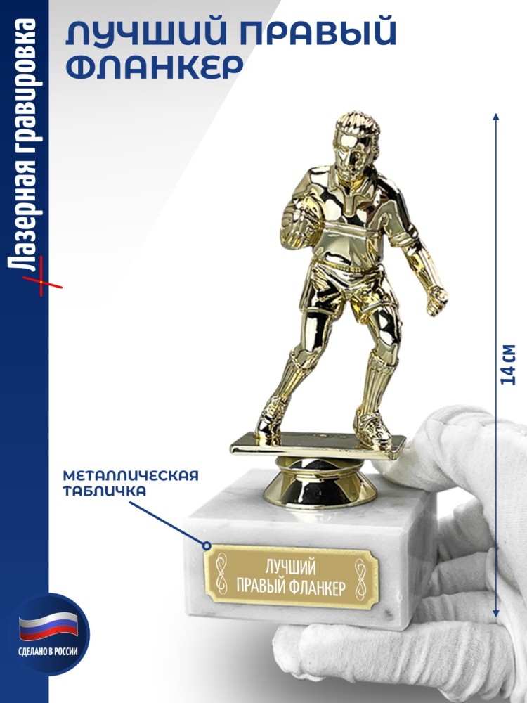 Лазерная гравировка наносится на табличку (шильд), приклеенную к подставке. Размер: 14 x 6,5 x 6,5 см. Высота фигурки без постамента: 11 см. Размер мраморной подставки: 6,5 x 6,5 x 3 см. Размер шильдика (таблички с надписью): 5 x 1,7 см. Материалы: пластик (фигурка), мрамор (постамент). Вес: 375 гр. Упаковка: картонная коробка. Наградная статуэтка «Регби» - предназначена для вручения участникам соревнований, тренерам и поклонникам американского футбола. Оригинальный подарок на любой праздник или награждение. Он станет достойной памятной наградой за победы и достижения от коллектива на память. Символизирует не только личные успехи, но и благодарность за труд и преданность делу. Актуально в качестве новогоднего сюрприза жене, мужу, отцу, взрослым родственникам (папе, дедушке, маме, бабушке), коллегам (начальнику), преподавателю или юбиляру. Такой красивый сувенир подходит для множества знаковых дат и событий дома и в офисе, на юбилеи родителей, международный женский день (8 марта), 14 и 23 февраля, Новый год или день рождения (ДР). Считается хорошим корпоративным подарком как для мужчин (сыну, брату, другу, любимому парню, руководителю), так и для женщин (начальнице, дочери, сестре, подруге или девушке). Юный регбист - это начинающий спортсмен, увлечённый динамичной и силовой игрой. Такой человек ценит командный дух и физическую подготовку. Уместен как презент для тех, кто стремится к развитию в этом виде спорта. Подчёркивает преданность регби и стремление к достижениям. 1785