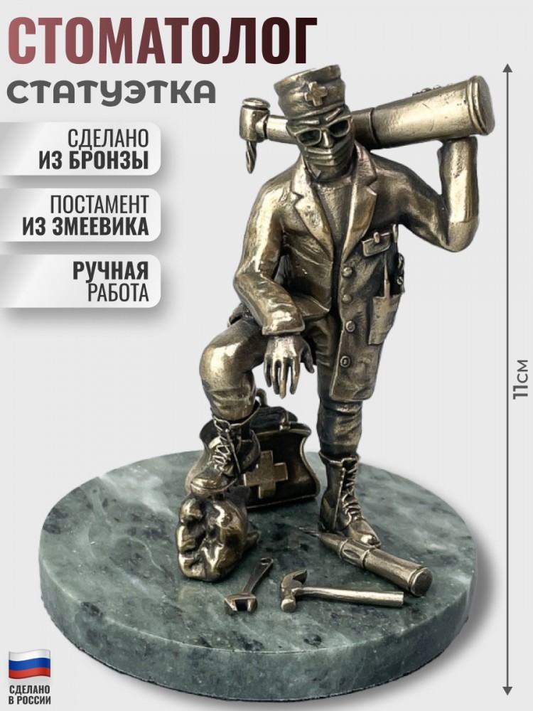 Статуэтка «Стоматолог» имеет размеры 11 x 9 x 9 см и высоту 11 см. Она изготовлена из бронзы и натурального камня змеевика с использованием технологии художественного литья. Вес статуэтки составляет 400 г. Это ручная работа российского производства, которая поставляется в деревянной коробке размером 15 x 13 x 12 см.