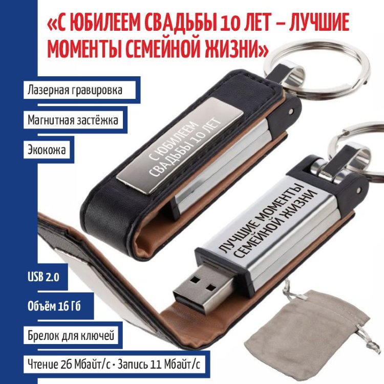 Флешка "С юбилеем свадьбы 10 лет. Лучшие моменты семейной жизни" в чехле (16 Гб) - описание товара