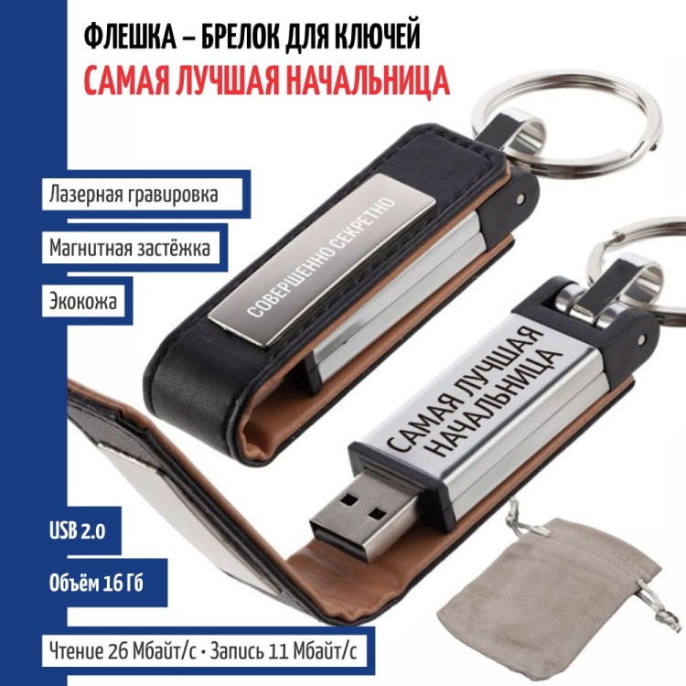 Лазерная гравировка нанесена на шильдик чехла и на лицевую сторону флешки. Размер: 7 х 3,5 х 3 см. Материал: Металл, Пластик, Искусственная кожа. Объём памяти: 16 Гб. Стандарт: USB 2.0. Упаковка: Полиэтиленовый пакет. Вес: 35 гр. На флешке имеется кольцо для крепления ключей. Скорость чтения не хуже 15 мб/сек, скорость записи не хуже 5 мб/сек. Подарочный USB флеш-накопитель в кожаном чехле объемом 16 Гб с надписью. Этот сувенирный Flash-накопитель в кейсе из кожи не только предоставляет большое пространство для хранения ваших данных, но и олицетворяет элегантность и функциональность. Внешний накопитель с гравирвокой совместим со всеми операционными системами и может использоваться на множестве устройств: компьютеры (в том числе как загрузочная флешка windows, linux), ноутбуки, телевизор, приставка, смарт-тв, машина, колонки и другие приборы с USB-портом. Флеш карта памяти идет с маленьким подарочным мешочком. Металлическая ЮСБ "Флешкарта" идеально подходит для сохранения объемных файлов, включая торжественные фотографии и видео, благодаря чему становится незаменимым аксессуаром как для мужчин (мужа, папы, брата, сына, друга, мальчика), так и для женщин (мамы, сестры, девушки, дочки, подруги). Оригинальный подарок на любой праздник или награждение. Начальница ежедневно управляет коллективом, принимает стратегические решения и сохраняет рабочую атмосферу. Её вклад в развитие компании и лидерские качества заслуживают внимания. Сотрудники могут выразить признательность на корпоративном мероприятии, подчёркивая уважение к профессионализму, деловому стилю и женскому лидерству. Особенно уместно это в переходные моменты - например, при завершении проекта или расширении штата. 2655