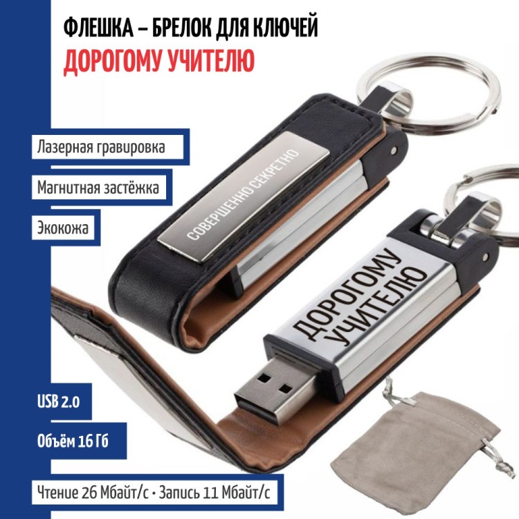 Лазерная гравировка нанесена на шильдик чехла и на лицевую сторону флешки. Размер: 7 x 3,5 x 3 см. Материал: Металл, Пластик, Искусственная кожа. Объём памяти: 16 Гб. Стандарт: USB 2.0. Упаковка: Полиэтиленовый пакет. Вес: 35 гр. На флешке имеется кольцо для крепления ключей. Скорость чтения не хуже 15 мб/сек, скорость записи не хуже 5 мб/сек. Подарочный USB флеш-накопитель в кожаном чехле объемом 16 Гб с надписью. Этот сувенирный Flash-накопитель в кейсе из кожи не только предоставляет большое пространство для хранения ваших данных, но и олицетворяет элегантность и функциональность. Внешний накопитель с гравирвокой совместим со всеми операционными системами и может использоваться на множестве устройств: компьютеры (в том числе как загрузочная флешка windows, linux), ноутбуки, телевизор, приставка, смарт-тв, машина, колонки и другие приборы с USB-портом. Флеш карта памяти идет с маленьким подарочным мешочком. Металлическая ЮСБ "Флешкарта" идеально подходит для сохранения объемных файлов, включая торжественные фотографии и видео, благодаря чему становится незаменимым аксессуаром как для мужчин (мужа, папы, брата, сына, друга, мальчика), так и для женщин (мамы, сестры, девушки, дочки, подруги). Идеальный подарок учителю любого уровня образования - от педагога начальных классов до преподавателя старшеклассников. Порадует классного руководителя, наставника и учительницу (в школе или учебном заведении). Особенный выбор для важных школьных событий: выпускной, последний звонок, 1 сентября или День учителя (5 октября). Подойдет для выражения благодарности от выпускника училища, ученика школы или целого класса и их родителей (родительский комитет). Универсальное решение для признания заслуг в образовании и обучении. Оценят как опытный педагог или репетитор с многолетним стажем, так и молодой преподаватель-наставник, работающий с младшеклассниками. Станет памятным презентом для всех, кто связан с передачей знаний и воспитанием. Поможет выразить искреннюю признательность любимой учительнице - от благодарных учеников до коллег. Красивый способ отметить вклад лучшего педагога в школьный праздник или учебный процесс техникума, в том числе и в гимназии, академии, колледже или лицее. 2655