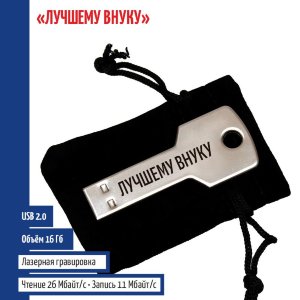 Внешний накопитель с гравирвокой совместим со всеми операционными системами и может использоваться на множестве устройств: компьютеры (в том числе как загрузочная флешка windows, linux), ноутбуки, телевизор, приставка, смарт-тв, машина, колонки и другие приборы с USB-портом. Флеш карта памяти идет с маленьким подарочным мешочком.