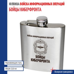 Размер: 12,5 x 9,5 x 2 см. Внутренний диаметр горлышка: 1,1 см. Материал: Пищевая нержавеющая сталь AISI 304 (фляжка), Металл (крышечка), Пластик (крепление крышечки). Герметичная: да. Объём: 210 мл. Вес: 90 г. Упаковка: Картонная коробка. Лазерная гравировка нанесена на лицевую сторону. Стальная фляжка - это не просто модный аксессуар серебряного цвета с надписью, но и практичный предмет, который идеально подходит для крепкого или безалкогольных напитков (алкоголя, коньяка, виски, рома, воды и др.). Плоская армейская фляга из нержавейки пригодится в любой поездке - будь то рыбалка или охота. Оригинальный подарок на любой праздник или награждение от коллектива (руководителю, коллеге). Он подчеркивает не только личные успехи, но и благодарность за труд и преданность делу. Сувенир актуален в качестве сюрприза мужу, взрослому родственнику (отцу, дедушке) или преподавателю. Такая красивая атрибутика подходит для множества знаковых дат и событий дома или в офисе, таких как юбилеи родителей 23 февраля, Новый год или день рождения (ДР). Считается хорошим подарком как для мужчин (папе, сыну подростку, брату, другу, парню), так и для любимой женщины на 8 марта. Войска информационных операций играют ключевую роль в современных условиях, обеспечивая защиту и контроль цифрового пространства. 1425