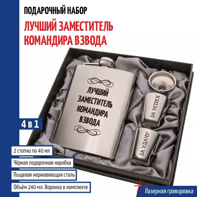 Набор 4 в 1 включает в себя стальную фляжку серебряного цвета (с надписью), что идеально подходит для крепкого или безалкогольных напитков (алкоголя, коньяка, виски, воды и др.).