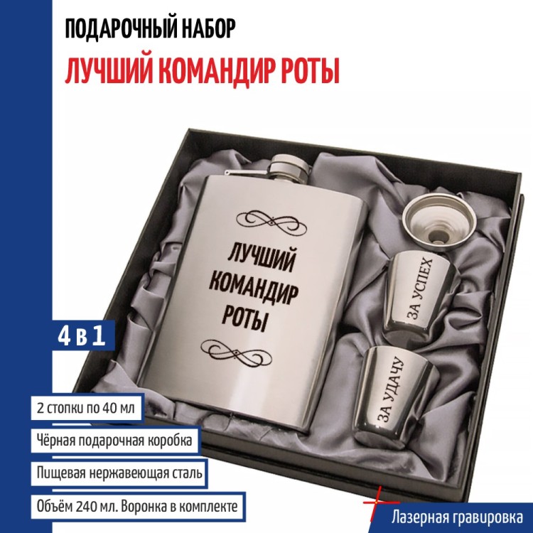 Набор 4 в 1 включает в себя стальную фляжку серебряного цвета (с надписью), что идеально подходит для крепкого или безалкогольных напитков (алкоголя, коньяка, виски, воды и др.).