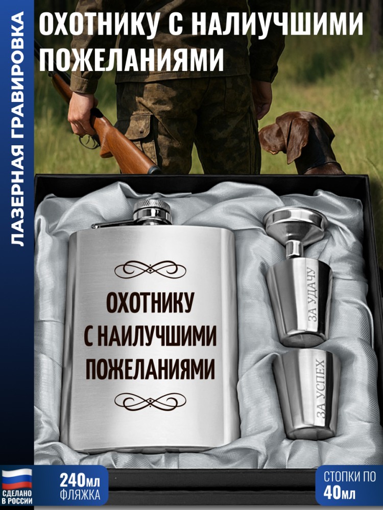 | Комплектация | Фляжка (240 мл), Воронка, Две стопки (по 30 мл) |