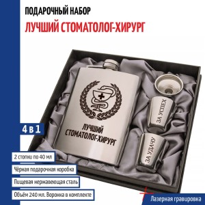 Набор 4 в 1 включает в себя стальную фляжку серебряного цвета (с надписью), что идеально подходит для крепкого или безалкогольных напитков (алкоголя, коньяка, виски, воды и др.).