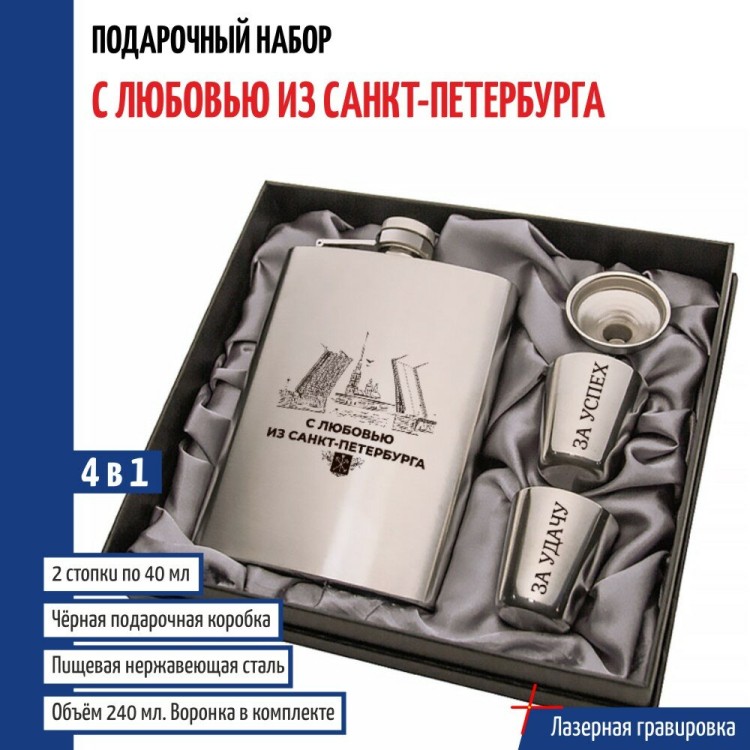 Набор 4 в 1 включает в себя стальную фляжку серебряного цвета (с надписью), что идеально подходит для крепкого или безалкогольных напитков (алкоголя, коньяка, виски, воды и др.).