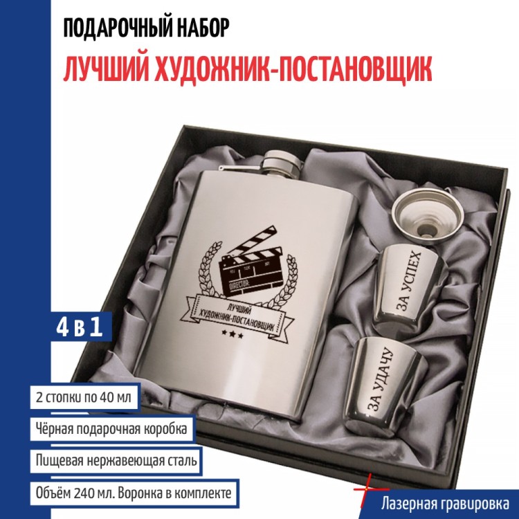 Набор 4 в 1 включает в себя стальную фляжку серебряного цвета (с надписью), что идеально подходит для крепкого или безалкогольных напитков (алкоголя, коньяка, виски, воды и др.).