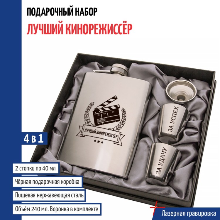 Набор 4 в 1 включает в себя стальную фляжку серебряного цвета (с надписью), что идеально подходит для крепкого или безалкогольных напитков (алкоголя, коньяка, виски, воды и др.).