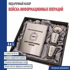 | Комплектация | Фляжка (240 мл), Воронка, Две стопки (по 30 мл) |