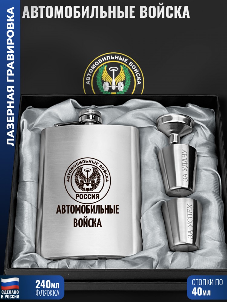 | Комплектация | Фляжка (240 мл), Воронка, Две стопки (по 30 мл) |