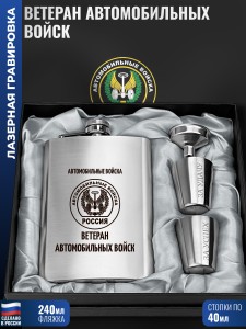 Фляжка: 14 x 9.5 x 2.5 см, из пищевой нержавеющей стали (AISI 304), объем 240 мл (8 oz). Две металлических стопки: нерж., по 30 мл. Воронка: 3,7 x 2,5 x 2,5 см, из нержавейки, слива : 0,7 см, залив (верхняя часть воронки): 3,7 см. Комплектация: Фляжка, Воронка, 2 рюмки, Коробка с ложементом (19 x 17 x 5 см). Набор 4 в 1 включает в себя стальную фляжку серебряного цвета (с надписью), что идеально подходит для крепкого или безалкогольных напитков (алкоголя, коньяка, виски, воды и др.). Плоская армейская фляга из нержавейки пригодится в любой поездке - будь то рыбалка или охота. Оригинальный и практичный комплект, который подойдет на любой праздник или награждение. Оригинальный подарок на любой праздник или награждение от коллектива (руководителю, коллеге). Он подчеркивает не только личные успехи, но и благодарность за труд и преданность делу. Сувенир актуален в качестве сюрприза мужу, взрослому родственнику (отцу, дедушке) или преподавателю. Такая красивая атрибутика подходит для множества знаковых дат и событий дома или в офисе, таких как юбилеи родителей 23 февраля, Новый год или день рождения (ДР). Считается хорошим подарком как для мужчин (папе, сыну подростку, брату, другу, парню), так и для любимой женщины на 8 марта. Автомобильные войска - важная составляющая современных вооружённых сил, обеспечивающая мобильность и логистику. 2799