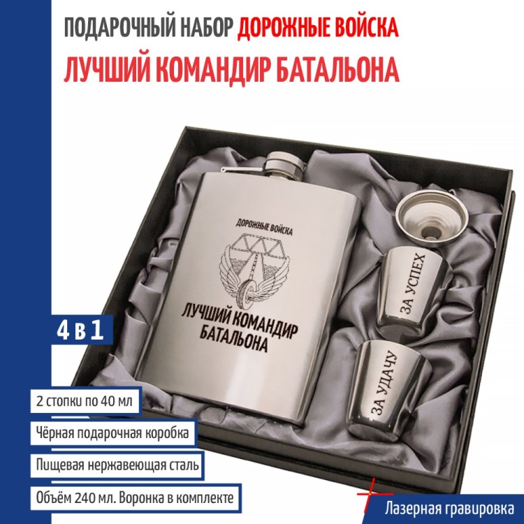 Фляжка: 14 x 9.5 x 2.5 см, из пищевой нержавеющей стали (AISI 304), объем 240 мл (8 oz). Две металлических стопки: нерж., по 30 мл. Воронка: 3,7 x 2,5 x 2,5 см, из нержавейки, слива : 0,7 см, залив (верхняя часть воронки): 3,7 см. Комплектация: Фляжка, Воронка, 2 рюмки, Коробка с ложементом (19 x 17 x 5 см). Набор 4 в 1 включает в себя стальную фляжку серебряного цвета (с надписью), что идеально подходит для крепкого или безалкогольных напитков (алкоголя, коньяка, виски, воды и др.). Плоская армейская фляга из нержавейки пригодится в любой поездке - будь то рыбалка или охота. Оригинальный и практичный комплект, который подойдет на любой праздник или награждение. Оригинальный подарок на любой праздник или награждение от коллектива (руководителю, коллеге). Он подчеркивает не только личные успехи, но и благодарность за труд и преданность делу. Сувенир актуален в качестве сюрприза мужу, взрослому родственнику (отцу, дедушке) или преподавателю. Такая красивая атрибутика подходит для множества знаковых дат и событий дома или в офисе, таких как юбилеи родителей 23 февраля, Новый год или день рождения (ДР). Считается хорошим подарком как для мужчин (папе, сыну подростку, брату, другу, парню), так и для любимой женщины на 8 марта. Дорожные войска играют важную роль в обеспечении транспортной инфраструктуры. Их деятельность связана со строительством, ремонтом и содержанием дорог в различных условиях. 2799