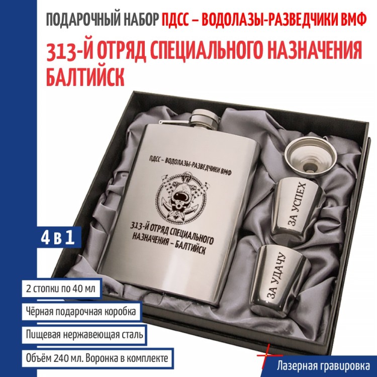 | Комплектация | Фляжка (240 мл), Воронка, Две стопки (по 30 мл) |