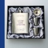 Набор 4 в 1 включает в себя стальную фляжку серебряного цвета (с надписью), что идеально подходит для крепкого или безалкогольных напитков (алкоголя, коньяка, виски, воды и др.).