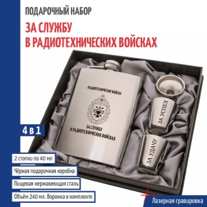 | Комплектация | Фляжка (240 мл), Воронка, Две стопки (по 30 мл) |