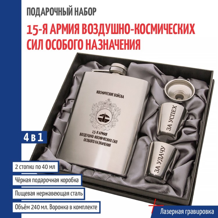 Фляжка: 14 x 9.5 x 2.5 см, из пищевой нержавеющей стали (AISI 304), объем 240 мл (8 oz). Две металлических стопки: нерж., по 30 мл. Воронка: 3,7 x 2,5 x 2,5 см, из нержавейки, слива : 0,7 см, залив (верхняя часть воронки): 3,7 см. Комплектация: Фляжка, Воронка, 2 рюмки, Коробка с ложементом (19 x 17 x 5 см). Набор 4 в 1 включает в себя стальную фляжку серебряного цвета (с надписью), что идеально подходит для крепкого или безалкогольных напитков (алкоголя, коньяка, виски, воды и др.). Плоская армейская фляга из нержавейки пригодится в любой поездке - будь то рыбалка или охота. Оригинальный и практичный комплект, который подойдет на любой праздник или награждение. Сувенир актуален в качестве подарка мужу, взрослому родственнику (отцу, дедушке) или для сослуживца. Актуально на 23 февраля, дембель или день рождения. Космические войска - род войск Воздушно-космических сил России (ВКС), отвечающий за безопасность и контроль в околоземном пространстве. Основные задачи КВ: мониторинг спутников, защита от угроз, обеспечение связи и навигации. Дарят к профессиональному празднику, дате формирования части или по случаю награждения, от сослуживца или командира. Актуально в День Космических войск России (4 октября), в честь повышения по военной службе или в знак признания заслуг. 2799