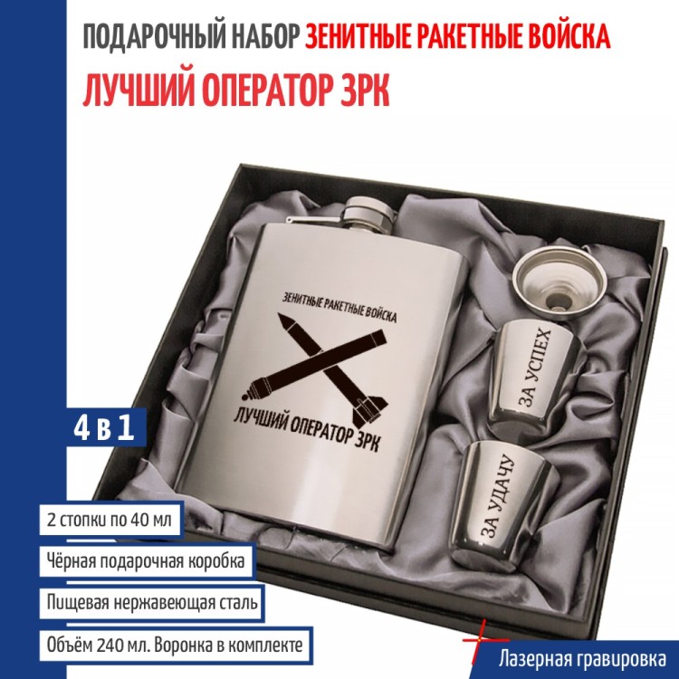 Набор 4 в 1 включает в себя стальную фляжку серебряного цвета (с надписью), что идеально подходит для крепкого или безалкогольных напитков (алкоголя, коньяка, виски, воды и др.).
