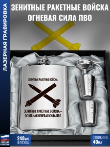 Фляжка: 14 х 9.5 х 2.5 см, из пищевой нержавеющей стали (AISI 304), объем 240 мл (8 oz). Две металлических стопки: нерж., по 30 мл. Воронка: 3,7 х 2,5 х 2,5 см, из нержавейки, слива : 0,7 см, залив (верхняя часть воронки): 3,7 см. Комплектация: Фляжка, Воронка, 2 рюмки, Коробка с ложементом (19 x 17 x 5 см). Набор 4 в 1 включает в себя стальную фляжку серебряного цвета (с надписью), что идеально подходит для крепкого или безалкогольных напитков (алкоголя, коньяка, виски, воды и др.). Плоская армейская фляга из нержавейки пригодится в любой поездке - будь то рыбалка или охота. Оригинальный и практичный комплект, который подойдет на любой праздник или награждение. Сувенир станет отличной памятной наградой за заслуги или победы, подходит для корпоративных и личных наград, на юбилей, Новый год, день рождения и другие значимые события. Актуально как подарок в качестве сюрприза от коллектива, друзей и близких. Подарок для военнослужащего ЗРВ - уместен ко Дню войск ПВО, при вручении награды, окончании учебного центра или выходе в отставку. Подчёркивает значимость службы в зенитных ракетных войсках и защиту воздушного пространства страны. Подойдёт офицеру расчёта, специалисту по ЗРК, в подарок ветерану зенитчику, курсанту академии ПВО или имениннику, связанному с военной противовоздушной обороной. Актуален к юбилею, на праздник или в знак уважения от сослуживцев, командира или семьи. 2799