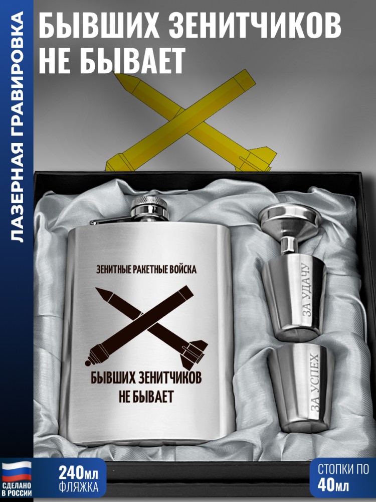 Фляжка: 14 х 9.5 х 2.5 см, из пищевой нержавеющей стали (AISI 304), объем 240 мл (8 oz). Две металлических стопки: нерж., по 30 мл. Воронка: 3,7 х 2,5 х 2,5 см, из нержавейки, слива : 0,7 см, залив (верхняя часть воронки): 3,7 см. Комплектация: Фляжка, Воронка, 2 рюмки, Коробка с ложементом (19 x 17 x 5 см). Набор 4 в 1 включает в себя стальную фляжку серебряного цвета (с надписью), что идеально подходит для крепкого или безалкогольных напитков (алкоголя, коньяка, виски, воды и др.). Плоская армейская фляга из нержавейки пригодится в любой поездке - будь то рыбалка или охота. Оригинальный и практичный комплект, который подойдет на любой праздник или награждение. Сувенир станет отличной памятной наградой за заслуги или победы, подходит для корпоративных и личных наград, на юбилей, Новый год, день рождения и другие значимые события. Актуально как подарок в качестве сюрприза от коллектива, друзей и близких. Подарок для военнослужащего ЗРВ - уместен ко Дню войск ПВО, при вручении награды, окончании учебного центра или выходе в отставку. Подчёркивает значимость службы в зенитных ракетных войсках и защиту воздушного пространства страны. Подойдёт офицеру расчёта, специалисту по ЗРК, ветерану, курсанту академии ПВО или имениннику, связанному с военной противовоздушной обороной. Актуален к юбилею, на праздник или в знак уважения от сослуживцев, командира или семьи. 2799