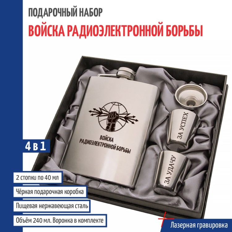 Фляжка: 14 x 9.5 x 2.5 см, из пищевой нержавеющей стали (AISI 304), объем 240 мл (8 oz). Две металлических стопки: нерж., по 30 мл. Воронка: 3,7 x 2,5 x 2,5 см, из нержавейки, слива : 0,7 см, залив (верхняя часть воронки): 3,7 см. Комплектация: Фляжка, Воронка, 2 рюмки, Коробка с ложементом (19 x 17 x 5 см). Набор 4 в 1 включает в себя стальную фляжку серебряного цвета (с надписью), что идеально подходит для крепкого или безалкогольных напитков (алкоголя, коньяка, виски, воды и др.). Плоская армейская фляга из нержавейки пригодится в любой поездке - будь то рыбалка или охота. Оригинальный и практичный комплект, который подойдет на любой праздник или награждение. Сувенир актуален в качестве подарка мужу, взрослому родственнику (отцу, дедушке) или для сослуживца. Актуально на 23 февраля, дембель или день рождения. Уместен как подарок за службу в войсках радиоэлектронной борьбы. Подчёркивает профессиональную принадлежность и преданность делу. Войска РЭБ - специализированные подразделения, обеспечивающие защиту и подавление электронных систем противника. Их задачи включают радиоразведку, создание помех и нейтрализацию средств связи и навигации. Уместны как для военных операций, так и для обеспечения безопасности стратегических объектов. 2799