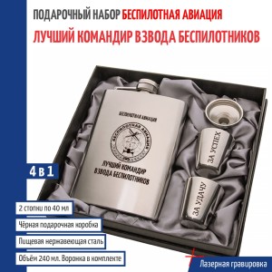 | Комплектация | Фляжка (240 мл), Воронка, Две стопки (по 30 мл) |