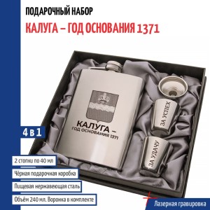 | Комплектация | Фляжка (240 мл), Воронка, Две стопки (по 30 мл) |